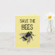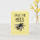 Ajude a salvar as abelhas! Estão a desaparecer a um ritmo alarmante. Na frente está uma imagem de uma abelha. Dentro é vazio para as suas notas/saudações e ambas as páginas têm cor amarela. Por trás estão informações sobre como ajudar a salvar as abelhas.