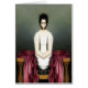 Uma menina assustadora com cabelo escuro curto, olhos grandes e entorpecidos e sem boca, seus braços aparecendo como camisa de força. Sentada em uma sala verde em um sanatório, um cobertor de cetim vermelho é enrolado ao redor de seu tronco sem pernas. Arte digital original de Taylor Addams.