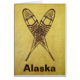 Um par cruzado de sapatos de neve num fundo de couro braintan. O texto personalizável lendo "Alaska" também é exibido. Há vários estilos diferentes de sapatos tradicionais de neve. As imagens aqui são feitas de Ash e moosehide babiche (webbing) no padrão do Alasca. Maior e mais fino que alguns outros estilos, como a pata de surra, os sapatos de neve do Alasca permitem uma porta mais natural e são adequados para o viagem entre países. As dicas levemente viradas para cima permitem que você arraste os pés um pouco. Aconselhem-se os calçados de neve a fazer um céu excelente; geralmente no pior momento possível.