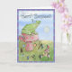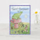 Um sapo de aniversário, com um chapéu azul pintado, senta-se sobre um cogumelo cercado por uma banda de inseto - cada inseto com seu próprio instrumento.