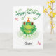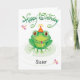 Faça sua atitude anfíbia com esta sapo numa almofada de lírio olhando para uma fatia de bolo de aniversário na frente dele. Mande isso para sua irmã que ama sapos e os deseja diversão!