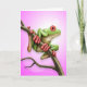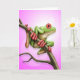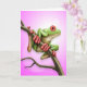 Um sapo de árvore verde é empoleirado em um galho na frente de um fundo de rosa claro. O sapo está olhando para a direita com um dos olhos vermelhos brilhantes visíveis. As mãos e os pés vermelhos da pequena cara estão envoltos num galho marrom fino que começa no fundo do design e se move para cima e para a esquerda. Este design brilhante e colorido faz um cartão bonito e divertido.