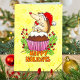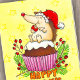 Este cartão mostra um pequeno ouriço vestindo um chapéu de Santa. Ele está feliz sentado em um cupcake de pudim de Natal, balançando no bago vermelho que estava em cima. O pudim de ameixa tem o tamanho de um bolo de xícara e é embrulhado em um copo de papel rosa. Os ramos de pequenos pinheiros e os ramos com as bagas vermelhas de inverno foram colocados em volta como decoração. O fundo é amarelo com um padrão de estrela alaranjado e desbotado. Sob o cupcake está escrito "Feliz Feriados" em letras laranja.