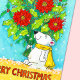 Envie esta carta de urso polar para desejar aos amigos e à família um Feliz Natal. No lado direito deste cartão, um urso polar está segurando um buquê gigante de Poinsettias vermelhas, uma flor tradicional de natal usada com frequência na decoração floral no inverno. O ursinho está vestindo um lenço amarelo brilhante, apertado com um nó simples na parte de trás do pescoço. Ele está diante de um terreno negro azul e sobre uma flor amarela na qual se escrevem cartas escritas à mão "Feliz Natal". As letras são marrons. Flocos de neve brancos pequenos estão espalhados sobre a pintura.