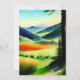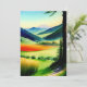 Uma placa de saudação plana apresenta um campo de montanha de cor d'água com árvore e caminho na frente. Uma pintura digital criada por meio de um software AI.