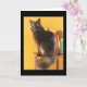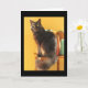 O gato preto está sentado sobre uma mesa cheia de cones de fio, o fundo é laranja/bronzeado com borda preta. Personalize o dentro de saudação de "Que seu dia seja caloroso e aconchegante" - "Parabéns!" para o seu próprio texto.