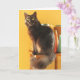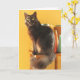 O gato preto está sentado sobre uma mesa cheia de cones de fio, o fundo é laranja/bronzeado. Personalize o dentro de saudação de "Que seu dia seja caloroso e aconchegante" - "Parabéns!" para o seu próprio texto.