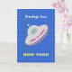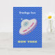 Saudações de disco voador em um fundo azul estrelado. Cidade e mensagem podem ser personalizadas. Compre este cartão de próxima geração e envie saudações aos seus entes queridos e amigos.