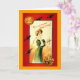 Cartão Vintage Halloween mostrando uma senhora bonito descascando uma maçã e jogando a casca sobre o ombro. Ela está fechada numa armação decorada com uma face de abóbora, uma cesta de maçãs e quatro morcegos pretos.
