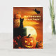 Saudações de Halloween! Um cartão de Dia das Bruxas festivo e divertido com todos os personagens legal do Dia das Bruxas. O Jack O' Lanterna está com grinos ferrados, um gato preto estoico, a levar para dentro. Uma bruxa voando no céu com uma lua grande de cheio!