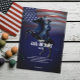 Ilustração digital de figura de comandante revolucionário a cavalo decorada com a bandeira dos Estados Unidos da América ao fundo. Este design patriótico e autêntico é perfeito para expressar saudações a amigos no dia 4 de julho, Dia da Independência, ou como um cartão postal. Todo o texto pode ser facilmente personalizado com o seu próprio.