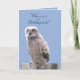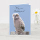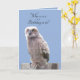 Owlet sentado na cerca "Quem - o - o - é Aniversário?" na frente. Dentro "É o teu aniversário! Tenham um dia de Excelente." em dentro com texto sobre a cabeça de coruja com fundo azul pálido. O texto dentro pode ser personalizado.
