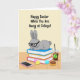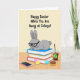 Designed with a cozy study-table scene, this digital illustration features a soft grey bunny wearing black-rimmed glasses, perched atop three textbooks in blue, orange, and rosy pink 🐰. The bunny’s gentle posture and calm gaze add a sweet, companionable tone, like it’s keeping someone company during a late-night study session. Everything sits on a warm wooden surface, surrounded by student essentials that make the moment feel shared rather than solitary. On the left, a slim personal device in a bright pink case rests near the edge, angled as if just set down after a message. In front of the books, three speckled pastel eggs in pink, yellow, and light blue hint at the season, with a small touch of 🌷 nearby to soften the scene. A clear cup holds a dark iced drink with a straw and a simple green emblem, sitting close to a chocolate-frosted doughnut covered in colorful sprinkles. Across the upper area, a large hand-lettered holiday greeting appears in a darker ink tone, standing out against the light background. The final touch is the trio of eggs lined neatly before the stacked books, their tiny speckles visible against the smooth pastel shells.