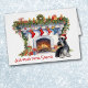 A frente deste cartão de saudação de Natal tem uma imagem de um adorável cão Terrier escocês vestindo um chapéu de Papai Noel vermelho e branco. O cachorro se senta em frente a uma lareira decorada, esperando expectativa por Papai Noel. O texto vermelho no fundo diz "Esperando por Papais noeis". O texto é personalizável, assim como todo o texto dentro, então você pode fazê-lo dizer o que quiser. Bonita! Veja imagens mais terríveis, junto com dezenas de outros produtos da raça canina, no Dog Village.