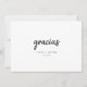 Diga obrigados com o nosso Cartões de agradecimentos de Foto de Casamento Espanhol "Script Gracias". Combina belos escrevendo, elegância, e o calor da gratidão espanhola sem falhas. Na frente deste cartão, "gracias" toma palco central, escritas em caligrafia, criando um ponto focal artístico. Personalize com nomes e a data para tornar cada cartão exclusivamente seu. Sacudir para o fundo, e uma querida foto ocupa o lado esquerdo, com uma sentida 'nota de gracias' à direita, expressando suas obrigados com amor. Esta carta captura a essência do seu casamento espanhol, incorporando simplicidade, elegância e um toque moderno. O design preto e branco adiciona uma qualidade de eterno, garantindo que se torne uma espécie de guardiã querida para vocês e para os vossos convidados. Ordene agora que partilhe sua apreciação de uma forma que ressoe com o encanto da cultura espanhola e preserve as memórias do seu casamento. Simples, elegante e cheio de amor - a maneira perfeita de dizer gracias.
