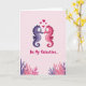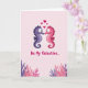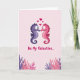 This design shows two stylized seahorses, one lavender and one fuchsia, facing each other with their snouts almost touching as their curved bodies create a heart-shaped space between them. Their gentle, mirror-like pose reads like a quiet underwater moment of romance 🥰. The background is a pale pink wash with a soft gradient that keeps the scene airy and calm. Above the pair, several bright pink hearts float upward like bubbles, adding a sweet touch ❤️. Along the lower portion, the text “Be My Valentine...” sits centered in fuchsia, with rounded, flowing lettering that stands out clearly against the light backdrop. Beneath the words, coral-like shapes in purples and pinks spread along the bottom edge, framing the couple like a reef. The seahorses’ curled tails and delicate fin details echo the rounded heart shapes above them. A faint shift from lighter pink at the top to slightly deeper pink near the bottom gives the whole card gentle depth.