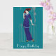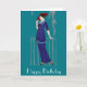 Feliz cartão de aniversário com uma senhora elegante inspirada pela era da moda deco do estilo do 1920. Esta moça da moda está vestindo um vestido azul e um chapéu vermelho em um fundo cor de rosa personalizável.