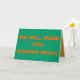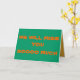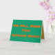 Um cartão de nota impresso em papel de qualidade.Um fundo verde quente na frente,texto" Sentiremos sua falta" Dentro em fundo amarelo laranja com o texto verde "Os bons amigos são duros de encontrar" Certifique-se de que a cama sobressalente é feita quando visitarmos"