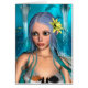 Sereia bonita com cabelo azul e verde e flor de lírio de água amarela em um fundo oceânico de fantasia azul