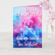 Sexo bonito revela cartão para família e amigos. O que será? Um menino ou uma menina? Fumaça rosa ou azul na frente. Dentro é, "É uma menina, que deve estar em (data de preenchimento)" E uma foto de uma menina loira.