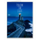 Farol no crepúsculo batendo seu farol no mar. As palavras "Siga a luz" são escritas em branco.