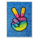 Ícone colorido do corante de gravata do movimento de paz dos anos 60 em um fundo de denim azul. A saudação de dois dedos representa uma preferência por soluções pacíficas em detrimento dos alternativos. O tecido psicodélico morto por gravata pode ser retrô agora, mas nos anos 60 era uma declaração hippie de moda. Personalize o texto de saudação alterando as palavras, o estilo do texto, a cor e a fonte. Também disponível como uma placa horizontal.