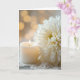 Uma vela brilhante senta-se ao lado de uma grande flor de crisântemo macio numa superfície de rendas rodeada de luzes de fundo quentes. Todo o texto pode ser alterado.