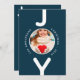 Um simples cartão de Natal minimalista, em azul e branco. Na frente: Um fundo azul clássico, com a palavra JOY escrita com letras brancas em negrito. A letra O é usada como quadro fotográfico. Personalize e adicione sua própria foto da família, nome e ano. Fundo: fundo azul e texto branco. Adicione seus próprios cartões de natal e nomes de família. As letras da palavra JOY como decoração.