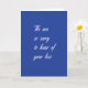 Simples cartão de compaixão com "Sentimos muito em ouvir sua perda" em uma fonte de script em branco em azul. O texto da dentro diz "Estaremos pensando em você", mas pode ser editado se quiser. Por vezes menos é mais quando se trata de expressar a vossa simpatia e de tentar não dizer a coisa errada. Manter a base, simples e sincera pode ser melhor.