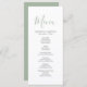 Adicione um toque refinado à decoração do seu casamento para receber com estes simples menus de casamento, desenhados num estilo moderno minimalista. Apresentando a palavra "Menu" em um roteiro elegante de caligrafia e impresso em verde-senso suave, esses cartões de janto podem ser personalizados com seus nomes e seleções de refeições para um acabamento personalizado. Perfeito para jantas de ensaio, festas de noivado e recepções elegantes de casamento, cada cardápio se reverte para uma cor sólida coordenadora para um olhar polido e coeso. Uma bela adição aos seus suprimentos de decoração de casamento. Explore a suíte de coordenação de cheios em www.zazzle.com/dotellabelle Art e design por Victoria Grigaliunas do Do Tell A Belle.