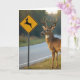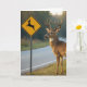 Um pinto fica ao lado de uma placa de estrada, que ironicamente exibe um veado saltando, ao lado de uma estrada tranquila que se estende por uma área florestal. O texto do dentro pode ser alterado.