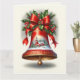 Um sino de Natal ricamente decorado, completo com uma fita vermelha exuberante e raminhos de azevinho, emoldura uma pitoresca cena de uma vila de inverno. A igreja e as casas cobertas de neve evocam uma sensação de nostalgia, enquanto os flocos de neve que caem suavemente adicionam à atmosfera mágica.