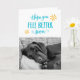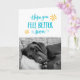 Esta fofinha fica bem, uma foto de um cachorro descansando em um sofá e as palavras "Espero que você se sinta melhor logo." Tipografia moderna escrita manual em azul com dois rabiscos amarelos. O sentimento dentro é "desejar-te bem!" em corresponder à tipografia.