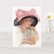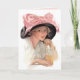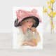 Jovem bebendo refrigerante enquanto veste um chapéu preto grande com arco rosa grande. Uma deliciosa cena vintage.