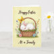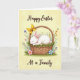 Designed with a soft, storybook-style illustration, this card shows a white bunny curled up asleep in a brown woven basket, its ears lined in pale pink and its eyes gently closed 🐰. A bed of green leaves cushions the bunny, and the basket handle is tied with a golden yellow bow that draws the eye. Around the basket, small spring flowers in blush pink, light blue, sunny yellow, and muted lavender form a loose ring like a garden gathering 🌷. The pale buttery yellow background and diffused light give the scene a tender glow, as if the bunny is being quietly watched over by someone dear. The overall layout feels like a cozy exchange between friends, with the calm pose and soft colors suggesting a caring, close bond. A flowing message in dark gray sits above the basket, while a shorter line in matching ink appears below, framing the picture without crowding it. Fine details show the basket’s interlaced strands, the layered leaf shapes, and scattered petals tucked near the base.