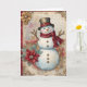 Um boneco de neve feliz em um chapéu e lenço é sobreposto a uma página de jornal de lixo composta de flores e folhas, papéis, texto e pequenos borrifos de neve neste charmoso cartão de feriado.