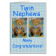 Dois pequenos ursinhos bonitos com arcos azuis sobre fundo gingham e o texto sobrinhos gêmeos Muitos Parabéns!