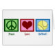 Placas Softball Peace Love com uma bela placa de paz, coração e bola.