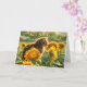 Um cartão do solstício de verão com um gato laranja listrado fofo assistindo a uma borboleta em um campo de girassóis de verão.
