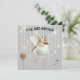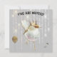 Convite de aniversário para crianças. O texto é personalizável, pelo que qualquer ocasião, incluindo as sonecas, é adequada. A cor de fundo também é personalizável. Pássaro de música em gotas brilhantes, pena e balão de ouro.