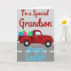 This greeting card shows a stylized utility truck in deep red driving along a cool gray road, its rounded fenders and simple profile giving it a gentle, friendly look. In the open bed, oversized egg-shaped forms pile high in pastel teal, lime green, hot pink, and sunny yellow, like a shared surprise meant for someone special 🐰. Behind the truck, the upper background is a pale brick pattern that feels like a quiet neighborhood wall, adding a cozy, familiar setting. The road beneath is marked with short white dashed lines that guide your eye forward, like the start of a sweet little trip. Near the top, a flowing line of text sits in dark red, centered and easy to spot against the light background. Near the bottom, a second line of text appears in light blue, placed over the gray area like a friendly note waiting at the curb 🌷. The contrast of warm reds with cool blues and soft neutrals makes the scene feel like a tender delivery between close friends. The white dashed lines run horizontally across the lower portion, evenly spaced beneath the truck’s wheels.