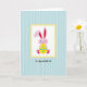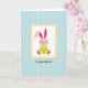 This card features a stylized light pink bunny sitting front and center 🐰, with tall ears tipped upward and warm red shading inside them. Its tiny dot eyes and small paws give it a sweet, friendly look, as if it’s shyly offering a gift to someone it cares about. Held close against its chest is a bright yellow egg-shaped treat decorated with a sky-blue band and two matching blue dots, like a little present meant for a close friend. The illustration sits inside a white rectangle bordered by a soft, scalloped yellow frame that feels like a gentle ribbon around the scene 🌷. Beneath the framed picture, the text “To a Special Little Girl!” appears centered in a casual handwritten look, set in a dark ink tone for easy reading. Behind everything, the background is pastel blue with uneven vertical white stripes that resemble soft fabric. The bunny’s pink body contrasts with the buttery yellow border, and the egg’s blue accents echo the pale blue field around it. The pastel blue background is patterned with irregular white vertical stripes stretching from top to bottom.