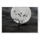Um bando de corvos negros na silhueta voa sobre uma paisagem desolada assustadora em frente a uma lua de cheio.