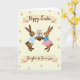 This card shows two light-brown bunny characters facing each other in a gentle, friendly pose 🐰. One wears a light blue-and-white striped shirt, while the other has a blue polka-dot top with a pink-and-white plaid skirt, giving them a sweet, coordinated look. Their paws meet around a small woven basket, as if they’re sharing a gift together, and their soft expressions suggest quiet affection. The basket is filled with pink and purple flowers and a few slender budding branches, adding a fresh spring touch 🌷. Behind them, a creamy yellow background is decorated with faint egg-shaped motifs scattered evenly across the page. A banner near the top holds a short seasonal greeting in dark lettering, and a second banner below includes a brief dedication in the same color. The lighting looks softly diffused, keeping the pastel tones gentle and the textures smooth. The lower banner curves under their feet, framed by the pale yellow field and the subtle egg pattern.