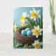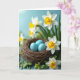 Designed with a soft spring still-life, the front shows a rustic bird’s nest made of thin brown twigs, gently cupping three smooth eggs in a calm robin-egg blue. Around the nest, clusters of white flowers with golden-yellow centers lean in close, like friends gathering shoulder to shoulder 🌷. Some blooms and leaves appear crisp and detailed, while others fade into a gentle blur, giving the scene a quiet, intimate closeness. The background is a pastel blue wash that looks like early morning light, keeping the mood light and airy. Green foliage threads through the arrangement in both sharp and softened patches, adding natural movement without crowding the nest. The greeting text sits near the top in a small, simple font, colored a warm golden yellow that echoes the flower centers 🐇. In the foreground, a few petals curve outward beside the twig weave, with the nearest flower’s yellow center shown in clear detail.
