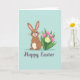 Designed with a sweet spring scene, this card features a stylized brown rabbit standing upright at the center against a soft blue-green background 🐰. The rabbit faces forward with long ears tipped in pink, a rosy nose and small smile, and bright eyes that feel like they’re meeting a friend’s gaze. A cream patch on its belly and fine whiskers add gentle detail that makes the character look tender and approachable. To the rabbit’s right, a cluster of tulip-like buds in rich pink rises from layered green leaves, with one fuller bloom showing many pale yellow petals 🌷. A faint shadow under the rabbit and flowers gives the scene a grounded, lightly romantic “standing together” feel without adding clutter. Near the bottom, a short Easter greeting appears in flowing plum lettering, centered and easy to read. The pink-tipped ears echo the pink blossoms, while the plum text sits neatly below the figures on the pastel field.