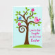 This design shows a stylized spring scene with a brown tree at the center, its arching branches dotted with fresh green leaves and two fuchsia blossoms with yellow centers. A pale blue sky sits behind the tree, fading into a rich green hillside that suggests new growth 🌷. On the left branch, a plump sky-blue bird perches with a small smile, angled toward the right as if watching its companion with gentle affection. On the right branch, a rounded soft pink bird faces back toward the blue one, their close spacing and mirrored poses hinting at a sweet bond 🐇. One lower branch curls into a spiral, adding a soft, flowing detail that draws the eye downward. The message “Love to Our Daughter on her First Easter” appears prominently across the upper area in fuchsia lettering, standing out against the pale blue background. Below the words, the tree trunk and the green foreground create a simple base, while the two bright blossoms sit near the birds like little bursts of color.