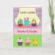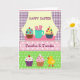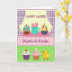 Designed with three horizontal panels, this spring-themed illustration uses soft pastel colors and cozy patterns to set a friendly, affectionate mood 🌷. The top panel has a gentle yellow background with purple-and-white checkered drapes along the sides, like curtains framing a kitchen scene. On a pink surface sit two frosted desserts with sprinkles and red fruit accents, placed on either side of a teal mug that holds two small patterned flags, arranged like a pair leaning toward each other. A holiday greeting appears above in thick, dark lettering, centered near the top of the yellow area. The middle band is rose pink with small white polka dots, and a short dedication sits across it in flowing cursive-style lettering in a darker shade for contrast. The bottom panel shifts to fresh green with white polka dots, showing two more decorated treats beside a small golden-yellow chick with orange beak and feet, adding a sweet companionable touch 🐰. Rounded scalloped edges border the whole piece, and the chick stands near the right side of the green panel next to the desserts.