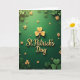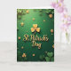 On the front of the card, raised gold lettering in the center reads “St. Patrick’s Day,” catching the light like a small celebration in itself 💚. Just above the title sits a detailed gold shamrock, its leaf sections marked with fine radiating lines like a little crown. The background is a deep emerald green that feels like a quiet field at dusk, setting off the warm shine of the gold. Across the scene, shamrocks are scattered in layers—soft matte green clovers along the edges and glowing gold ones drifting through the middle ☘️. The gold clovers look slightly lifted from the surface, with gentle shadows that make them seem close enough to touch. The arrangement feels like friends gathered in close, with the central message held steady while the clovers circle around it like shared glances and easy laughter. The text stays centered and gold, while the surrounding clovers alternate between muted green and metallic gold against the rich green backdrop. Subtle lighting skims across the raised gold details, leaving soft-edged shadows beneath the shamrock and the scattered clovers.