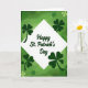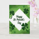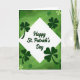 This card features a white, diamond-shaped banner centered on a field of layered green tones, setting a cozy St. Patrick’s Day scene with a gentle, friendly glow 💚. Across the banner, the text “Happy St. Patrick’s Day” sits neatly in dark emerald green, with the letters flowing smoothly from left to right. Behind it, the background shifts from deep forest green to lighter lime shades, like sunlight moving across leaves and drawing you closer. Dark green four-leaf clovers are scattered around the banner, some fully visible with stems and others cropped at the edges, as if they’re leaning in to share the moment ☘️. A few clovers overlap the banner slightly, creating the feeling of closeness, like friends squeezing together for a photo. Soft curled patterns and hazy, bokeh-like spots drift through the green backdrop, adding a light, dreamy motion without taking attention from the greeting. The banner’s crisp white stands out sharply against the greens, while the clovers and faint swirls fill the corners and edges with layered texture.